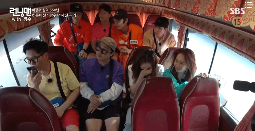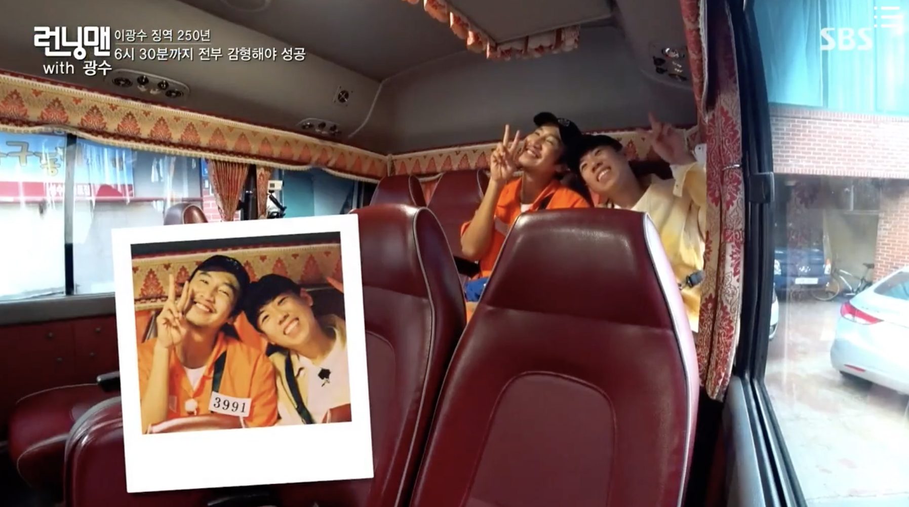 With that, Suk-jin calls Bo-hyun and manages to actually strike up a conversation with the actor! Everyone else is shocked by the results and how gullible Bo-hyun seems. The actor doesn’t seem suspicious at all and continues to chat with Suk-jin who sort of doesn’t sound like Kwang-soo, lol. Eventually, Suk-jin succeeds and the truth is revealed to Bo-hyun by Kwang-soo and Jae-suk. When asked if Bo-hyun had a strange feeling, Bo-hyun admits that he did. However, he didn’t bring anything up because he didn’t want to hurt Kwang-soo’s feeling and thought that maybe Kwang-soo sounded a bit different because he was crying after wrapping up the show. Aww, Bo-hyun is so sweet. With that, the game ends and our team succeeds once again! 300 years is shed off of Kwang-soo’s sentence. Woo hoo! As the bus inches closer to their final destination, the members pull yet another trick on Suk-jin who’s caught taking a nap in the front of the bus. They wake him up by pretending to finish a mission and PD Bo Pil joins in on the joke by announcing that Suk-jin has agreed to leave the show. Omg, hahaha. They are too funny!
