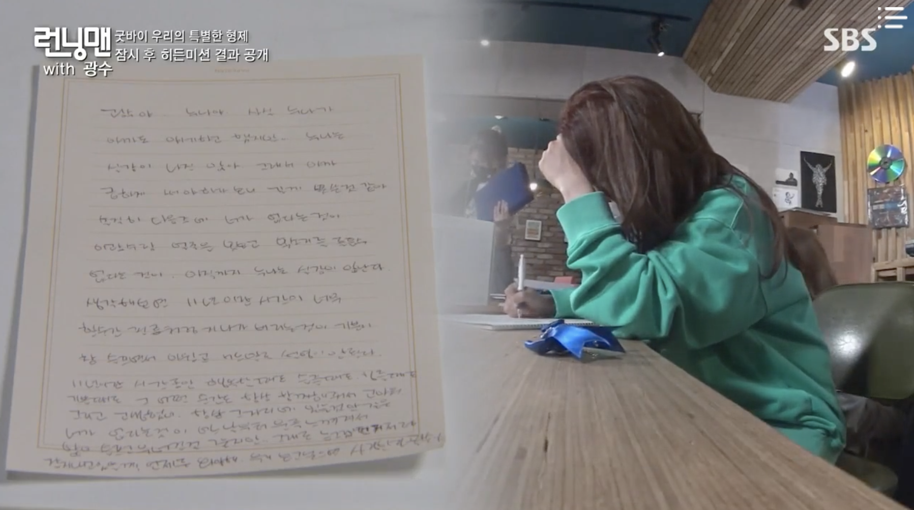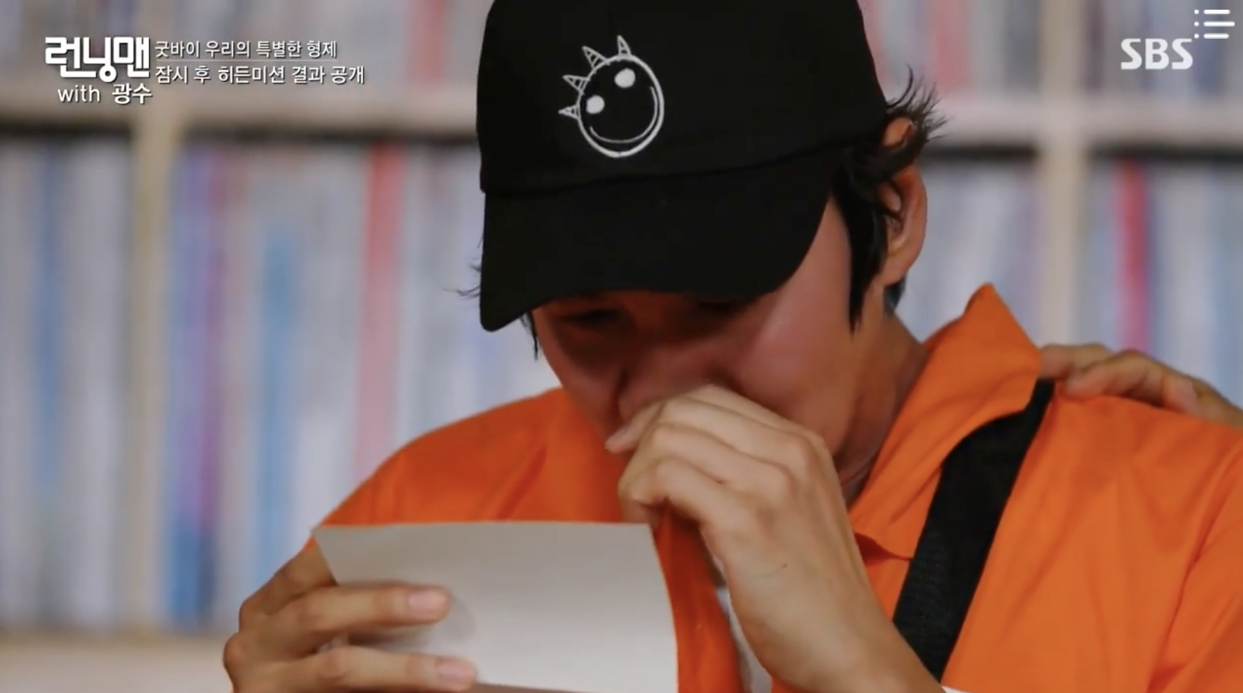 Kwang-soo is the last one to go and it’s his turn to read his letter. The silence is unbearable and quite long; no words are spoken but it’s obvious and clear how everyone is feeling in the room. After a few seconds, Kwang-soo is able to open up his heart and his mind and he reads his letter to the rest of the members,