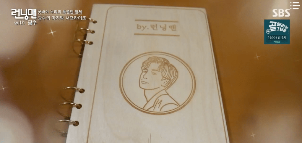 The gifts are brought out and presented to all the members. Suk-jin receives a designer bag, Jae-suk receives the designer hoodie, Haha gets some designer pants, Somin gets the champagne since she likes sweet champagne, Ji-hyo gets a bedding set since she likes to sleep, Jong-kook gets the sound bar since he likes to watch Netflix on TV, and Se-chan gets a picture frame. Now it’s time for Kwang-soo to receive some gifts for all his years of hard work on the show and he’s gifted with a golden name tag with his name on it. Name tags are the symbol of ‘Running Man’ so it’s a gift Kwang-soo will never forget. However, that’s not all. All 112 staff members of the show put together a journal with written messages to Kwang-soo. Kwang-soo also gets a speaker as another gift since he enjoys listening to music. Of course, the members joke around and question whether the speaker is PPL so Kwang-soo gives a thumbs up to the camera while smiling (omg, silly Kwang-soo!). They add that Kwang-soo can use the speaker and enjoy it with his girlfriend. Aww. Kwang-soo also receives the photo album of the photos that were taken throughout the day and two coupons with one pertaining to coffee trucks that he talks about often.