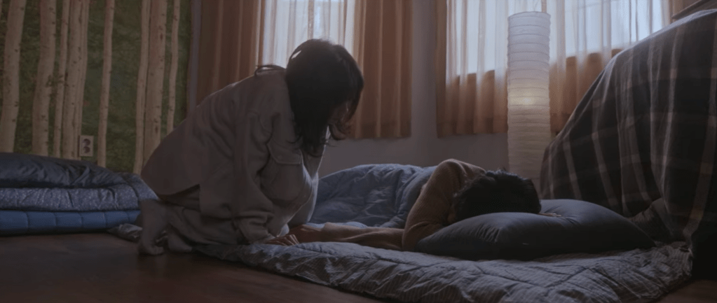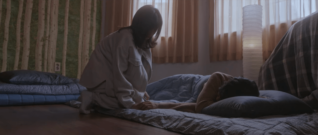 The next morning, Yeon-soo and Choi Woong are allowed to sleep in and stay inside for a tad bit longer. It’s been a while since either of them have been able to get as good of a sleep. When Yeon-soo awakens, she discovers the empty and silent house. No one’s inside except for Choi Woong who’s still asleep in his room. She tiptoes inside his room to take a peek at his latest drawing of their lodge. She also takes a peek at Choi Woong himself whose eyes are still closed. Just like she did on their first trip, she gently presses his glabella, but he doesn’t react. Or at least not with his eyes. He motions his hand slightly over Yeon-soo’s hand and for a second, their hands touch. But Yeon-soo panics and she removes her hand shortly afterwards and leaves. It’s not until she’s gone that Choi Woong opens his eyes. He was awake the whole time.