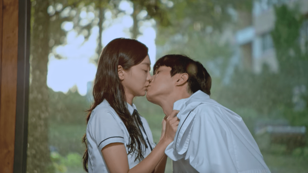 Yeon-soo pushes Choi Woong away and rejects his help. If he’s sick of the situation, she will gladly get out of his way. But Choi Woong doesn’t let Yeon-soo go. He stands in her way and hovers the umbrella over her head to protect her from the rain. With a serious look on her face, Yeon-soo asks Choi Woong twice whether she should leave or stay. Does he want her to leave or to stay? It doesn’t take long for Choi Woong to give her his answer. He pulls her in for a kiss and their lips meet. Memories of all their kisses dating from that rainy day in high school all the way to their current one flashes in their minds. It’s as if Choi Woong knew that this exact moment would happen from the moment they reunited.
