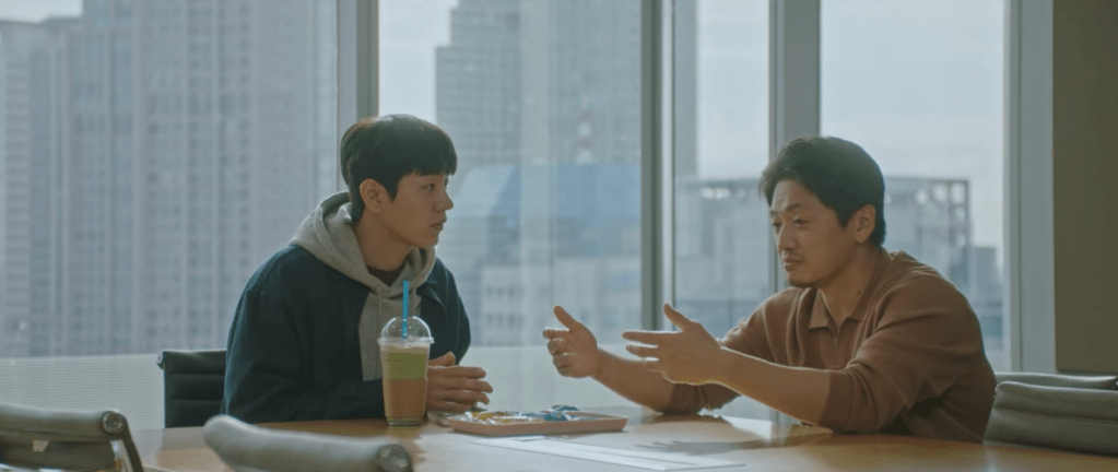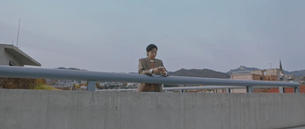 NJ films for the documentary and introduces herself as Choi Woong’s friend. She’s concerned as to how to be presented for the video since, well, her company isn’t aware that she’s participating. Regardless, her attention diverts to Yeon-soo and Choi Woong when they show up a few seconds later to the filming site. NJ notices a strange and odd vibe between Yeon-soo, Choi Woong, and Ji-woong and points it out. Something seems off about the three of them.