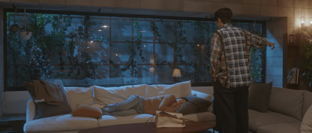 So Yeon-soo sleeps out on the couch with a blanket that her new friend, Choi Woong, generously gifts her. He stays in the living room with her for a bit and observes her sleeping until Yeon-soo’s phone lits up with a phone call from Ji-woong. Of course, since she’s asleep, she doesn’t pick up, but Choi Woong definitely notices the call. Choi Woong spends the entire night working and revisits Yeon-soo the next morning only to find his living room empty. She must have gone home. But nope, Yeon-soo didn’t. She’s happy to finally make a new friend other than Sol-yi and it turns out she just went to take a shower. LOL. It’s Choi Woong’s turn to get some sleep. We’ll see if Yeon-soo is gone by the time he wakes up, haha.