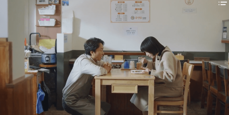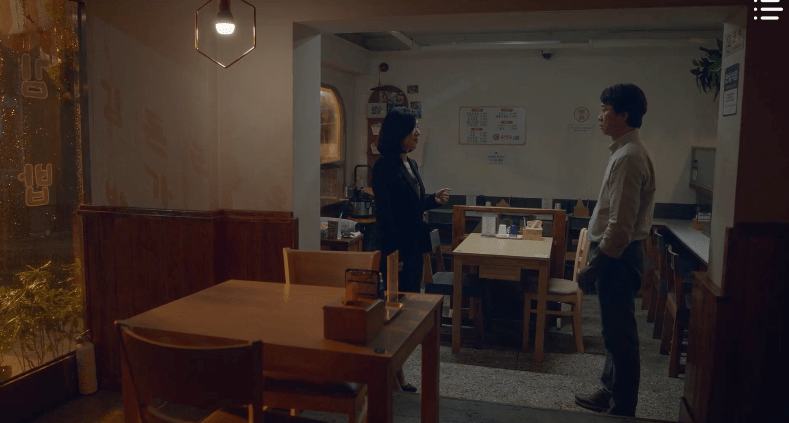 Later on that night, CEO Han stops by Dad’s restaurant to make a visit. Upon seeing each other, Dad freezes and is at a loss for words. He’s unsure as to how to react or what to say. CEO Han refers to Dad as “Sunbae” and the two stand across from each other inside of his little gimbap shop in silence.
