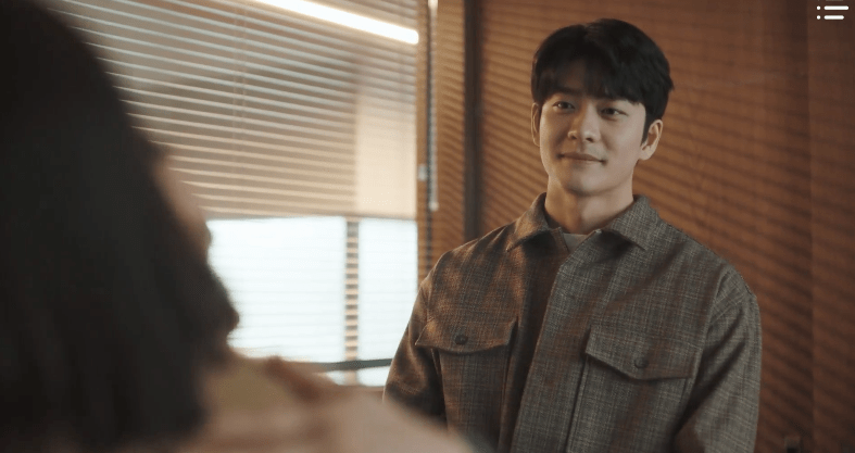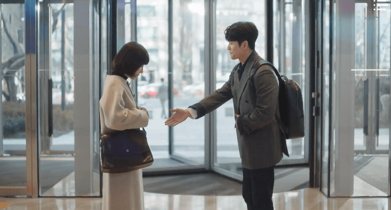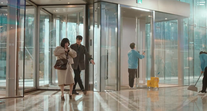 While waiting in the lobby for the employee, Young-woo encounters Jun-ho once again. Same place. Just a few hours later. She strikes up a conversation with him about the revolving door and it becomes clear to Jun-ho that Young-woo isn’t the biggest fan of the revolving door. As a solution, he suggests that they think of it as dancing a waltz and walk through the door with a certain rhythm. One, two three. One, two, three. He counts to the rhythm and Young-woo follows along. Eventually, he makes a phone call to the attorney he’s accompanying to the hospital who happens to be the one standing across from him the entire time. Hehe. They formally introduce themselves to each other, shake hands, and dance their way through the revolving door and out of the building. Wow, who knew revolving doors could be so romantic? *heart eyes*