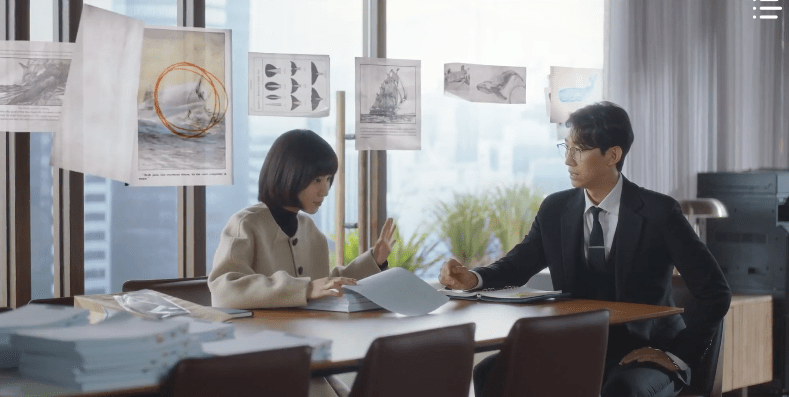 While on the subway, Young-woo listens to whale sounds and vocalizations and even imagines a huge sperm whale accompanying her on the ride to work. When Young-woo eventually arrives to her workplace, she encounters her first daunting task: the revolving door located at the entrance of the building. She’s uncertain as to how to enter and can’t quite get the timing right. Thankfully, a young man assists her and together the two make it past the doors and into the lobby of the building. It turns out that the man, Jun-ho (Kang Tae-oh), is also heading to the same law firm as Young-woo so they accompany each other. Hehe.