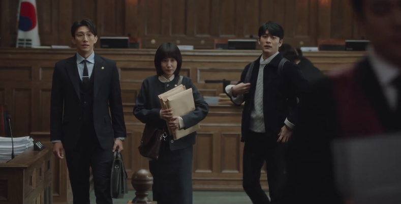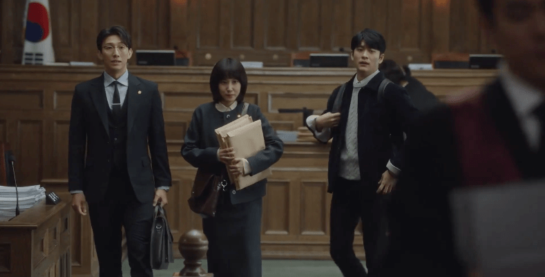 As Jun-ho greets other employees at the law firm, Young-woo is fascinated with the office and the environment. With the help of Jun-ho, she reaches her destination: Attorney Jung Myeong-seok’s office at Lawfirm Hanbada. She enters the room to find Attorney Jung (Kang Ki-young) with two other attorneys, Soo-yeon and Min-woo, and introduces herself to the group but they’re taken aback by her presence. They weren’t expecting her to be there and they don’t quite understand her unique introduction. Attorney Jung steps aside with Young-woo’s resume in his hand while Young-woo stays behind with the two employees. Turns out she knows Soo-yeon since they went to law school together.