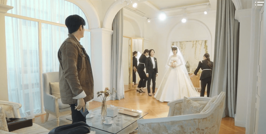 While waiting for Young-woo, Jun-ho takes a phone call from Soo-yeon who overheard one of the staff on the wedding team chat on the phone in the restroom. The staff member, Ji-hye, is out running an errand for the team director and complains about it to her friend on the phone while in the restroom. Turns out Ju-hui, the former staff member who worked at Hwa-young’s wedding, was fired after the wedding incident. Jun-ho steps out of the room and follows after Ji-hye who’s seen carrying a bag of bread into the staff room. He inquires for Ju-hui’s contact information, but Ji-hye isn’t willing to give away the information so easily. With that, he returns to the room where Young-woo is for the big dress reveal and stops his phone call with Soo-yeon upon seeing his bride.