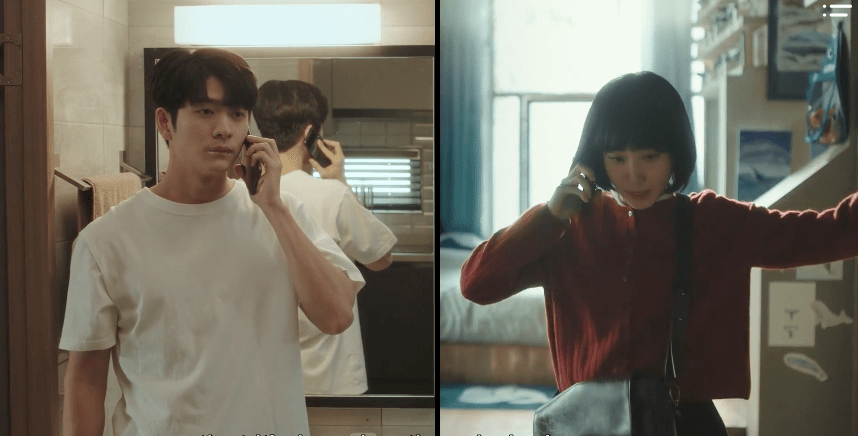 Jun-ho goes on to give Young-woo his answer and listens as Young-woo loops in the topic of whales in response, but Soo-yeon isn’t having it. She interrupts the conversation and Jun-ho is forced to hang up. Jun-ho admits that Young-woo has interacted with him a few times in the past to talk about whales. Whether it’s in the morning before getting ready for work or leaving work or exiting the men’s restroom, Jun-ho receives surprise visits or calls from Young-woo to listen to her whale talks. Although Jun-ho doesn’t mind the surprise interactions, Soo-yeon suggests that Jun-ho create boundaries with Young-woo so that he doesn’t have to listen to her talk about whales all the time.