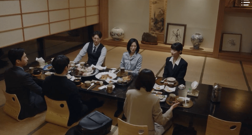 To celebrate the win, Team Hanbada eat out at a nice restaurant on CEO Han’s treat. CEO Han is a bit late, but she joins the team nonetheless. Young-woo munches on her favorite seaweed sushi while Soo-yeon enjoys some rice porridge due to her upset stomach, but everyone else eats the yummy expensive stuff. Even though the court trial didn’t go as planned, Mr. Kim was impressed with the team and is now a loyal client to the law firm so there’s that. They eventually pick up their drinks to celebrate. Young-woo’s seat at the corner of the table is a bit further away so she struggles to reach the middle of the table. But no fear. Jun-ho notices and clinks his shot cup with Young-woo’s cup before taking a sip (LEE JUN-HOOOOOOO. THE MAN THAT YOU ARE).