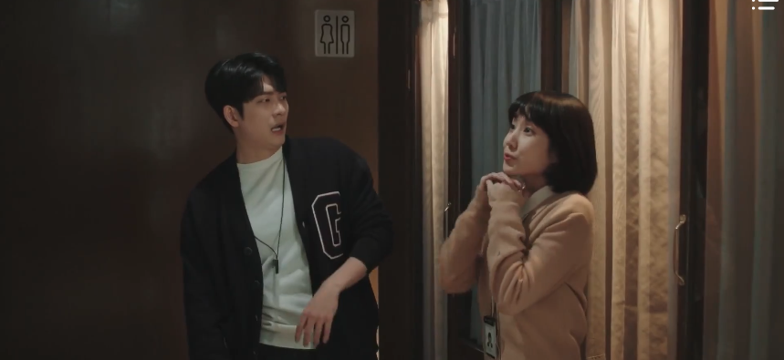 So with that, Soo-yeon heads back into the restroom stall while Young-woo heads back out to the lobby to reunite with Jun-ho. Without disclosing any details, Young-woo shares that she and Jun-ho will have to call each other “sweetie” now. Jun-ho isn’t so sure what to make of the situation, but since they are on a secret mission, they hurry for their appointment with the team director of the wedding business team at the hotel.
