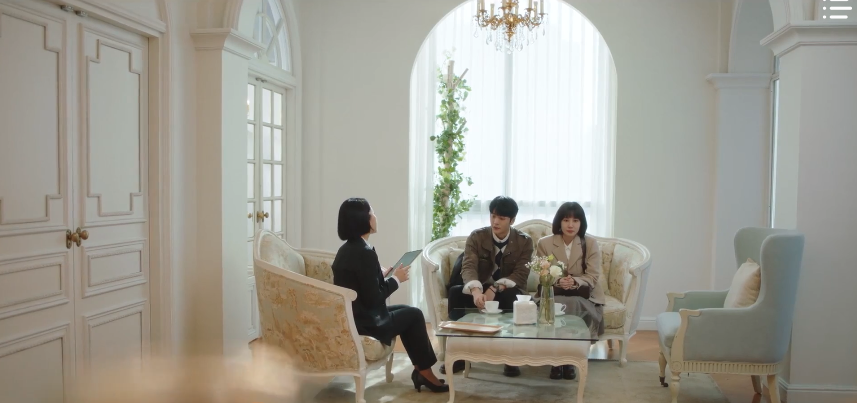 Hwa-young adds that she felt like something was off about her dress the morning of her wedding, but was reassured by the hotel staff that it felt loose due to reasons like weight loss. She also mentions how she wasn’t as involved with the invitations as it was her father who was responsible for the guest list. Young-woo makes the most out of the visit and asks Hwa-young an honest and straight-forward question: does she love her husband? There’s photos all over the bedroom of family and friends and there’s a photo hidden in the corner of her husband. Does Hwa-young love him? Though both Min-woo and Hwa-young are taken aback by the question, Young-woo has a point and Hwa-young struggles to answer the question.