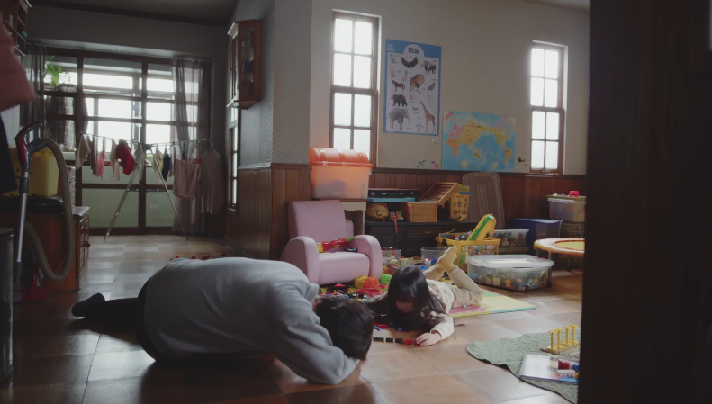 We’re brought back to when Young-woo was still a little kid. Dad had just gotten off the phone with his mom who nagged at him to resume with his love life and get married. She’ll take care of Young-woo for him. But Dad isn’t so opened to the idea and he has no plans of doing so. After ending the phone call, he walks out to the living room where Young-woo is playing with her legos and unfortunately steps on one of them. Of course, the pain is tremendous and he lays down on the ground in pain. However, Young-woo pays no attention to him which is just as painful as the physical pain from the lego itself. He attempts to have a conversation with his young daughter: what does she want to be when she grows up? Someone who plants lego pieces on the floor? But young Young-woo says nothing and resumes with playing with her legos.