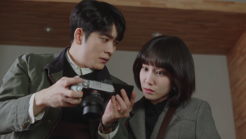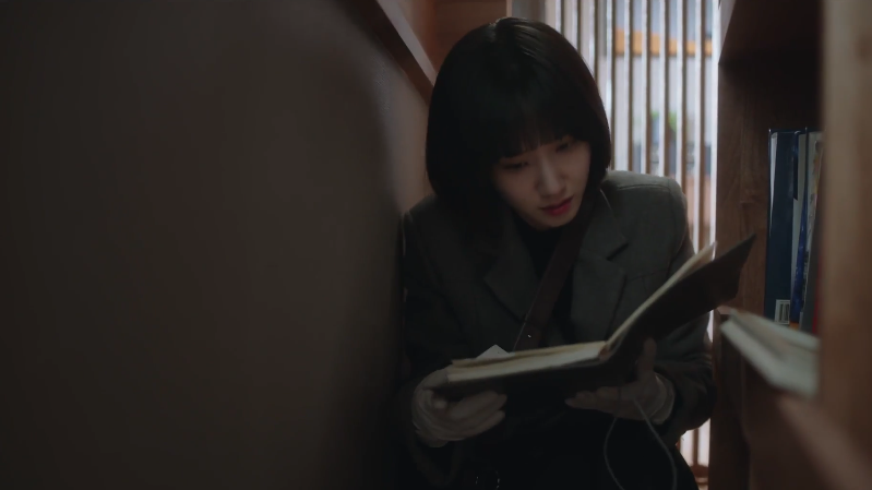 So the two lovers colleagues roam around the room with the camera pointed up to continue their search. Instead of a revolving door, Jun-ho and Young-woo waltz around the bedroom this time and it’s just as romantic as the first time (why is it that the smallest thing they do together seem so romantic? I’m going nuts over here because my heart feels so full and fluttery). To their surprise, they find a rope laying on top of the bookshelf in the room. They grab that as evidence, but that’s not the only thing that they discover. Young-woo also finds Sang-hun’s diary that had fallen down behind the bookshelf. The entries date to the year before and they’ll definitely need to take that with them too.