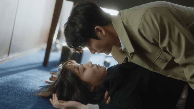 After the intense confrontation, Jun-ho decides to check in with Young-woo at the office later on that day. Just as he approaches the front of her office, he sees her with a rope around her neck and rushes in to save her. He wraps his left arm right below her bottom and uses his right hand to untie the knot around her neck. As a result, the two of them fall back and down onto the ground. Jun-ho lays right on top of Young-woo and the two stare at each other for a few seconds until it finally dawns on Young-woo what happened. She reaches another epiphany and the whale vision she gets when she realizes something shows up on the screen.