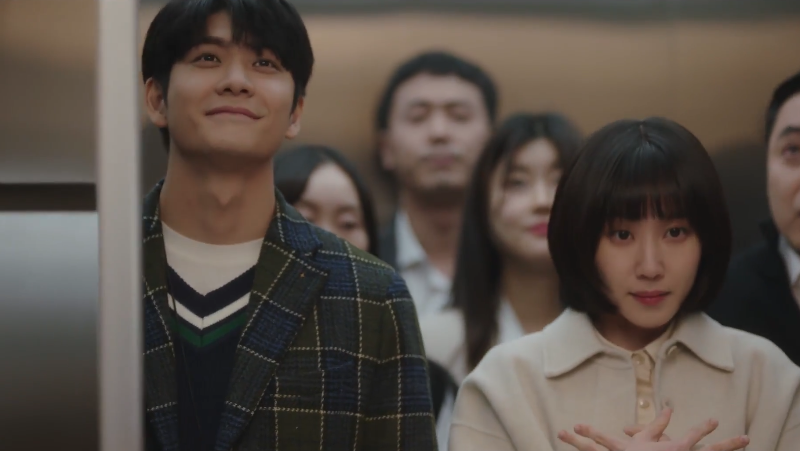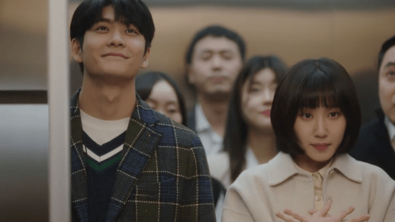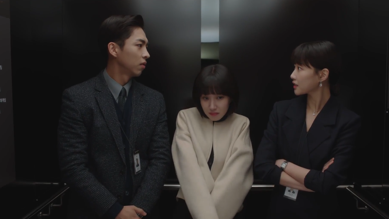 It’s everyone’s favorite time of the day: lunch time! Jun-ho waits with a group of his hungry co-workers for the elevator to head down to the cafeteria together. But not so fast! Jun-ho catches Young-woo walking to her office so he stops the elevator from going down and has everyone wait in the elevator for her. Hahaha. LEE JUN-HOOOOO. Young-woo grabs the lunch that her dad has prepared for her and eventually joins everyone else in the elevator.