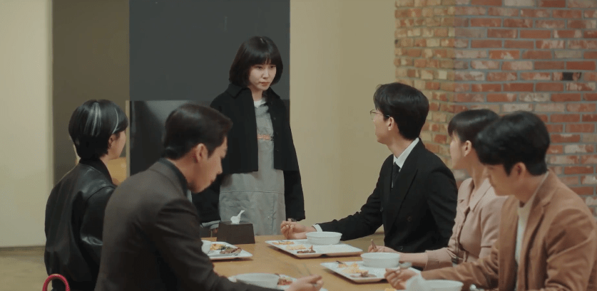 Dong Geu-ra-mi joins the Hanbada team for lunch. She seems to have taken a liking to Min-woo and she seats herself next to him at the table. Hahaha. Attorney Jung and Soo-yeon are there and Jun-ho also joins in on the fun. Young-woo shows up shortly afterwards and gets straight to the point. They have to take on the case or else Dong Geu-ra-mi’s father will be in an extreme amount of debt due to the memorandum. So who exactly will take on the case? It can’t be Soo-yeon or Min-woo. If Young-woo is really that desperate, she’ll take on the case herself.