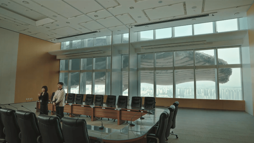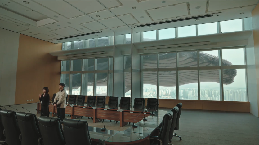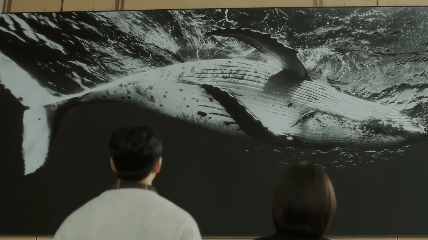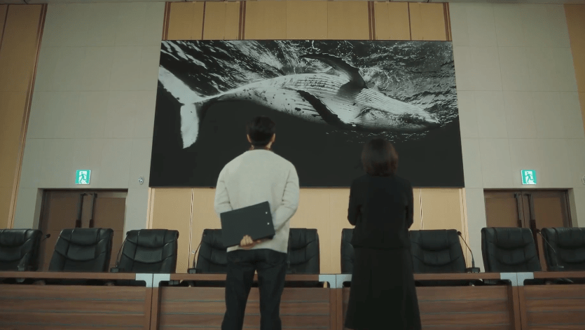After the trial concludes, Young-woo goes on another field trip with Jun-ho. This time, they head to the main conference room that Young-woo herself has yet to be in as there’s something that Jun-ho wishes to show her. So when she enters the large conference room, she heads straight to the windows for the beautiful outside scenery. But there’s another view that’s even bigger and more beautiful standing right behind Young-woo. Along with Jun-ho, Young-woo turns around and stares at the huge sperm whale photo plastered on the wall. That’s what Jun-ho wanted to show her.