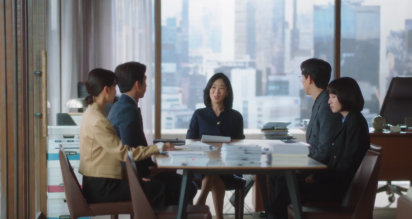 She’s interested in the highway construction case that the group is taking on since Attorney Tae is involved in it. Attorney Jung gives CEO Han a breakdown of the case as well as a status update on how it’s going so far. Things don’t look so great, but they’re hoping that the on-site verification of Sodeok-dong might bring them some luck and sway things towards their side. But CEO Han finds the method to be a bit too “romantic”; emotional appeal isn’t always the most effective. She recommends that the team close the case more politically and less romantically. Get one of the media outlets in favor of Hanbada involved and have them assist in stirring up public opinion. She wraps up the meeting by reminding that the team must win against Attorney Tae and Taesan.