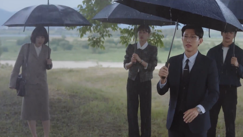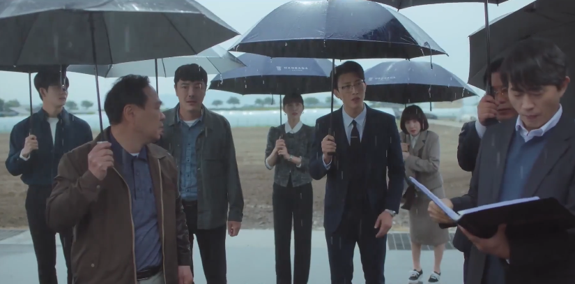 It’s the day of the on-site verification, but the weather isn’t looking that great. It’s pouring rain and everyone has their umbrellas with them. Our Hanbada team is the first to arrive, but it’s the Taesan team who arrives fashionably late. They have their own customized umbrellas with the name of the law firm on it so Hanbada also pull out their customized umbrellas with the Hanbada name on it. Hahaha. Always trying to be on the same level. I love it. Eventually, the two law firms are joined by a media outlet who Hanbada invited as well as the judges. Young-woo takes special notice of the judges’ umbrellas as it has a logo of a dolphin on there. The dolphin lover is impressed.