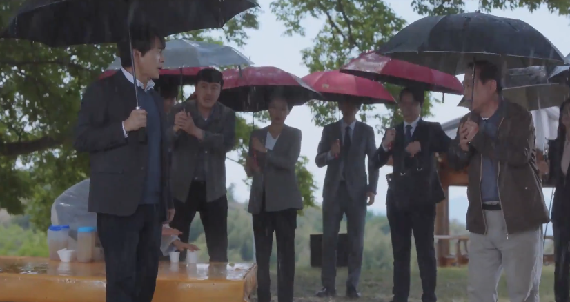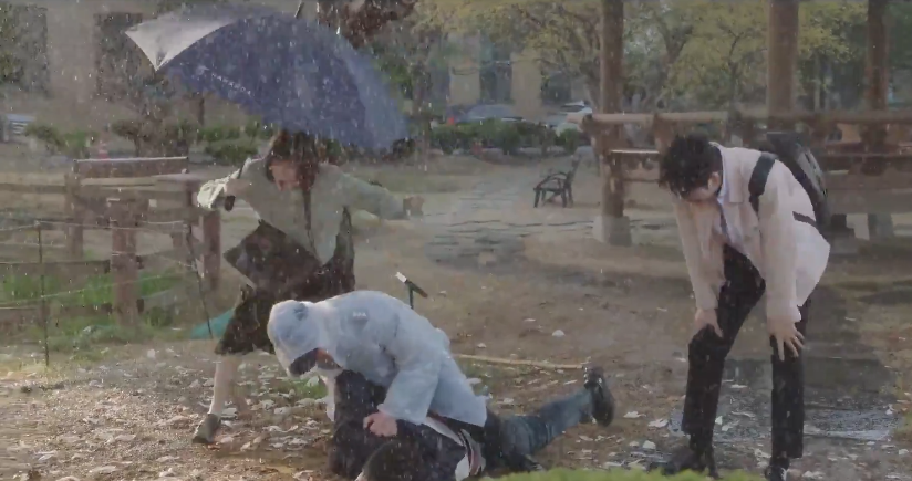 So Jun-ho and Young-woo chase after Yu-jin who escapes out of the building. They run and run even in the pouring rain and only manage to catch up to the him when a stranger nearby stops him. So with Yu-jin caught, Young-woo and Jun-ho talk to him again and this time, he doesn’t escape. He instead confesses the truth to them. Because of the news about the highway construction, he actually never proceeded with the request to evaluate the hackberry tree as a natural monument. And those experts who supposedly visited the hackberry tree? It was just a group of friends from his workplace who he recruited to play pretend. Young-woo glances at Yu-jin’s umbrella lying on the floor and notices the same dolphin logo that was seen on the umbrella that the head judge carried during the on-site verification. She learns that it’s an umbrella that a construction company called Kyungpyo Construction handed out to people who were visiting their model houses.