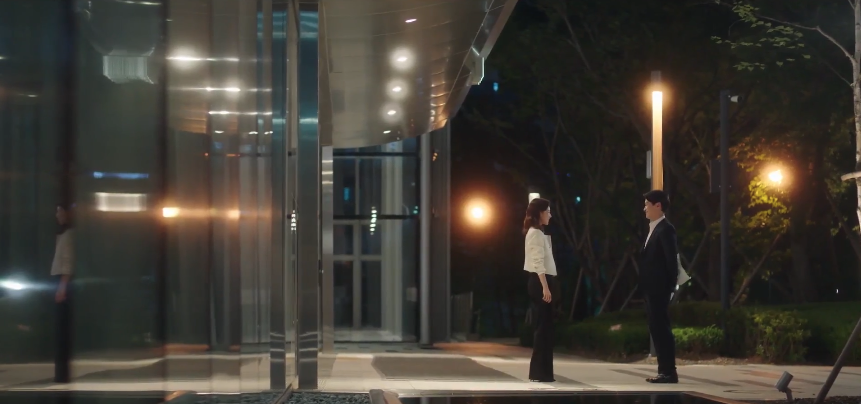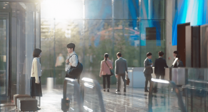 Young-woo waits patiently in the lobby for her lover and best friend, Jun-ho. The man himself enters through the revolving door shortly afterwards and the couple reunite. They’re quite content to see each other; Young-woo wanted to see Jun-ho since she noticed how he wasn’t in the office at his usual time and Jun-ho is happy to know that Young-woo was waiting for him. Hehe. Eventually, Young-woo is called by Attorney Jung to head to the conference room. They have a meeting with a new client. The two lovers agree to meet at lunch for their usual lunch dates. Hehehe. I can’t stop smiling because of these two.