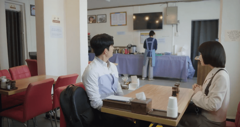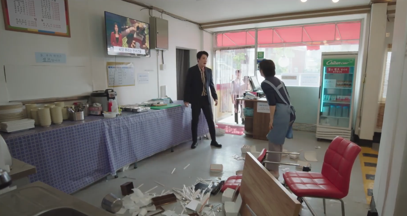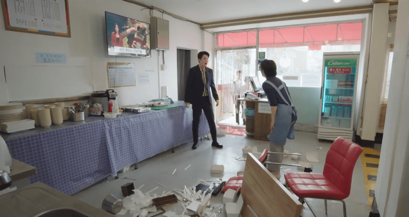 Attorney Jung warns Young-woo not to say anything to Mrs. Sung about Mr. Shin’s question. As an attorney, it’s her job to protect her client. So if Young-woo can’t interact with Mrs. Sung from a legal standpoint, maybe she can still interact with her as a customer. Mrs. Sung does own a gimbap shop after all. With that, she and Jun-ho take another field trip to visit Mrs. Sung’s gimbap shop. However, on the walk to the place, they overhear loud commotion coming from inside of the restaurant. When the couple reach the entrance door, they discover Mr. Shin and Mrs. Sung arguing with each other over money and Mr. Shin slamming a bunch of items onto the floor.