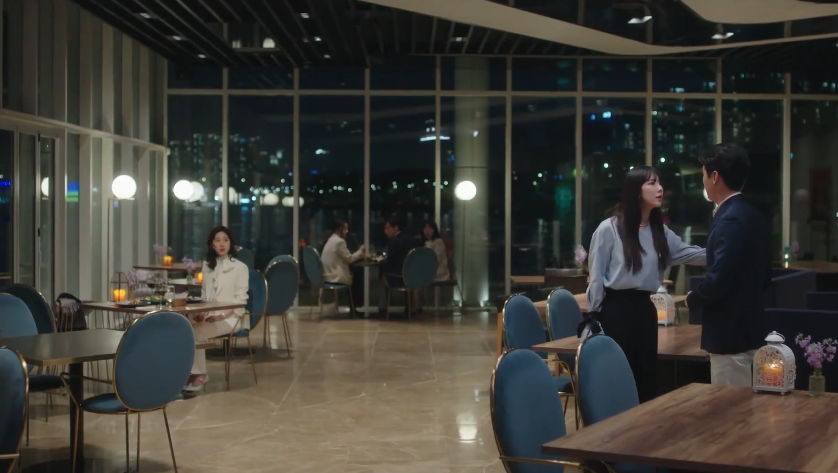 Soo-yeon enjoys another date out with Jong-gwon at a nice restaurant. Things are going well between the two until he excuses himself to the restroom and another woman replaces him at the table. Turns out she’s another one of Jong-gwon’s victims who has suffered at his hands before. He’s a player who dates women with elite jobs and plays around with them. He’s a scammer. To prove her point, the woman confronts Jong-gwon when he returns from the restroom. Disgusted, Soo-yeon exits out of the restaurant herself, but she stops by the bar for the most expensive alcohol bottle before leaving. She notes that Jong-gwon will pay for it and she chugs the alcohol on her way out of the restaurant.