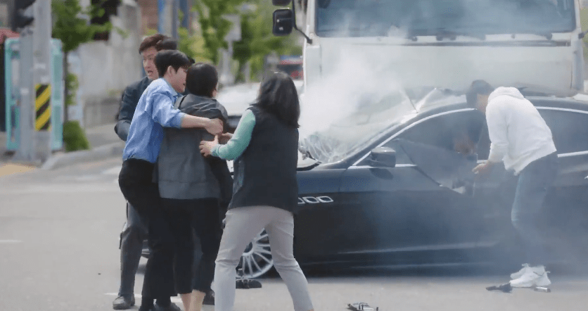Jun-ho and Young-woo drop Mrs. Sung off to her gimbap shop after the meeting. On their way to the shop, they encounter an angry and impatient Mr. Shin waiting across the street with his brand new luxury car. He’s in disbelief that Mrs. Sung has already met with attorneys and he urges for Mrs. Sung to cross the street to talk to him. As a precaution, the three head back to Jun-ho’s car to protect themselves. Mr. Shin himself then rushes back into his car and drives across the street to confront them, but gets plowed by a huge garbage truck on the road along the way. Time stops for Jun-ho, Young-woo, and Mrs. Sung as Mr. Shin’s car is crashed into. Mrs. Sung rushes to her husband’s side and she wails upon seeing her deceased husband.