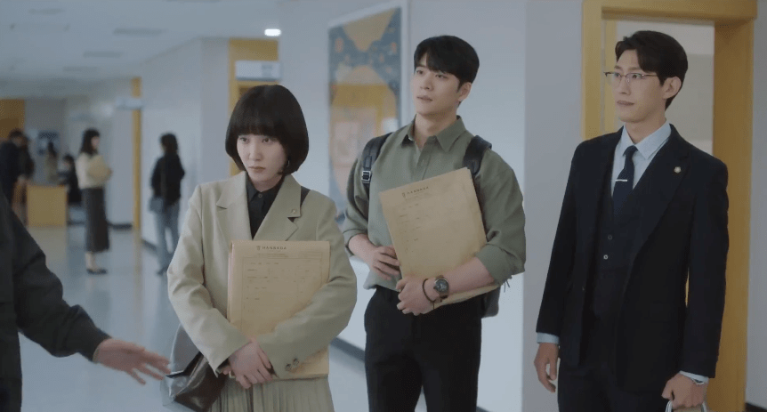 Young-woo encounters CEO Han in the elevator on the way to the conference room. CEO Han sparks up a conversation with the young attorney and checks in on her employee. Does Young-woo have any concerns or has anyone been bothering her lately at work? Young-woo is a bit hesitant at first as her concerns are personal, but she ends up sharing them to CEO Han. She’s been pondering about kisses and whether there’s a way you can kiss someone and also be able to breathe at the same time. Hahaha. The concern is not what CEO Han expected and she’s a bit flustered by the information. As for Young-woo? She simply goes on with her day.