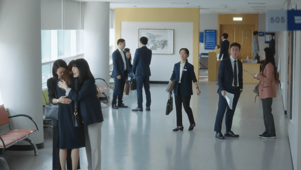 Once the trial is over, the witness, Ms. Choi, reunites with Ms. Kim and Ms. Lee. They catch up for a few short minutes and it’s like the old times again back when they used to work together. Ms. Choi feels guilty for her testimony and she breaks down into tears upon seeing how friendly and kind both Ms. Kim and Ms. Lee still are to her. They all cry together and Attorney Ryu witnesses the bittersweet moment in the hallway.