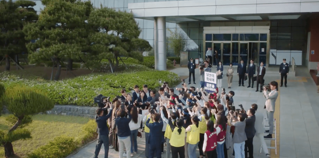 A current female employee with Mir Life is brought in to testify next. When asked about her perception of Mir Life’s company policy, she admits that she didn’t think it was discriminatory. In her case, her husband chose to voluntarily resign and she remembers the parts during her meeting with Mr. Moon about the benefits that came with voluntary resignation including severance pay as well as contract work. But Ms. Kim reacts in frustration in the courtroom; the company is attempting to use the restructuring as a way to turn female employees into non-full-time employees. The witness grows frustrated; there’s already so much going on with the merging of the company and now there’s the lawsuit. The current employees at the company are exhausted.