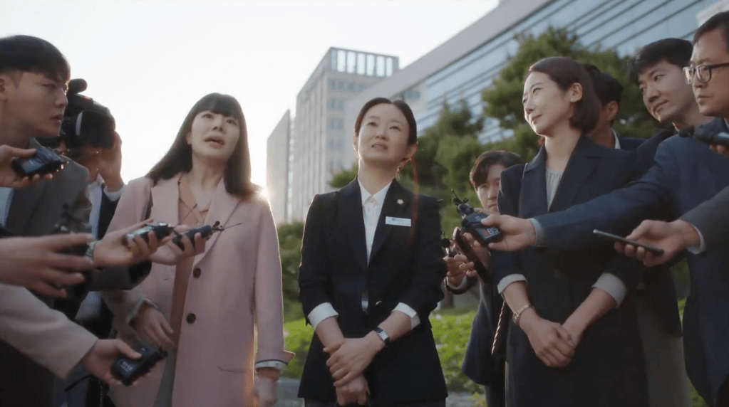 In the next court hearing, Young-woo questions Ms. Lee who’s up on the witness stand. She’s brings up the infertility treatments that Ms. Lee had been receiving since the year before and accuses her of using the voluntary resignation as an opportunity to continue receiving the treatments since she must have been preparing for pregnancy. But Ms. Lee argues that even if she did get pregnant, she would have still worked at the company. After some back and forth banter in the courtroom between Attorney Ryu and Soo-yeon, Young-woo once again reiterates her statement to Ms. Lee: didn’t she take this opportunity to get severance pay and resign in order to prepare for pregnancy instead of holding out at a company that was in crisis? The courtroom packed with reporters and members from women’s organizations all watch as the chaos unfolds.