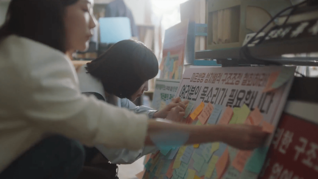 Protests and rallies about Mir Life’s restructuring policy continue to happen outside of their headquarters. Ms. Lee and Ms. Kim as well as members of women’s organizations and labor unions protest together against Mir Life. Eventually, a verdict is reached for the lawsuit and Presiding Judge Ryu announces the decision. Ms. Lee and Ms. Kim’s claims are dismissed and they are ordered to pay the litigation costs. The policy was acceptable from a socioeconomic perspective and since the policy also did not specify gender, the policy cannot be viewed as an act against gender equality. Folks in the courtroom are shocked and in disbelief at the final results. Though they lost the lawsuit, Ms. Lee, Ms. Kim, and Attorney Ryu stay united and strong. They all place their hands together in the courtroom and smile at each other. Even if the outcome wasn’t what they were hoping for, it was well worth the try.
