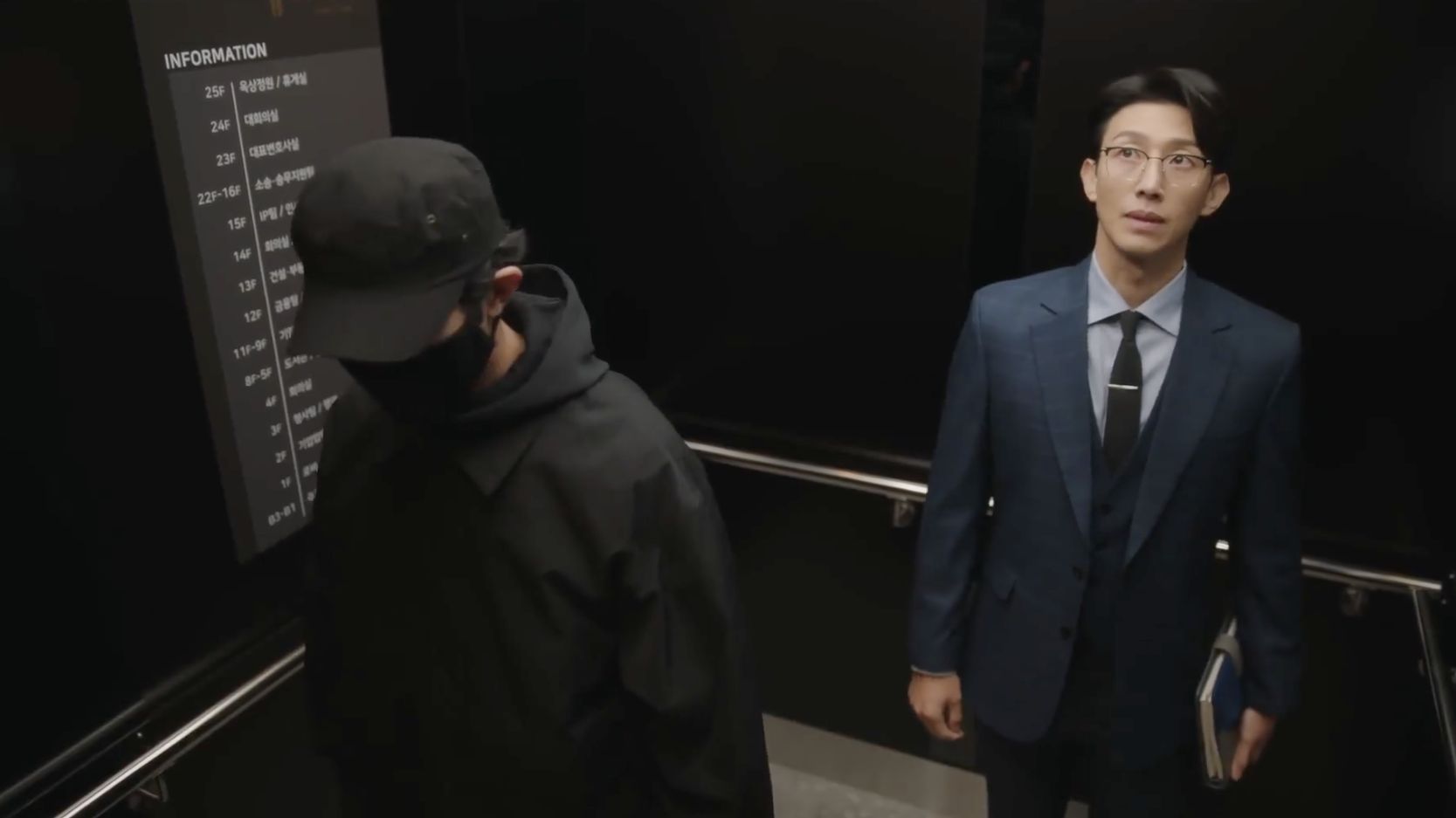 Attorney Jung receives an unexpected visit from CEO Han in his office. She invites him to go with her to the hospital to visit another attorney named Attorney Park. He and Attorney Jung worked together on a case and defended Jang Jae-jin, the son of the chairman of construction company, Hyeonbo Construction. After being released from prison, Jae-jin went to Attorney Park’s home and swung a knife at him. Thankfully, Attorney Park isn’t too injured, but Jae-jin is still roaming out and about. He hasn’t been caught. Though CEO Han reassures Attorney Jung that she’s amped up security to keep an eye out for anyone suspicious, a man dressed all in black with a face mask on scares Attorney Jung. The two are the only ones in the elevator together and Attorney Jung is reminded about the incident involving Attorney Park. Thankfully, nothing happens in the elevator and the suspicious-looking man exits. Attorney Jung attempts to follow him, but the man is no where to be found (wow, this elevator scene felt like a horror drama for a second! I was so scared for Attorney Jung!).