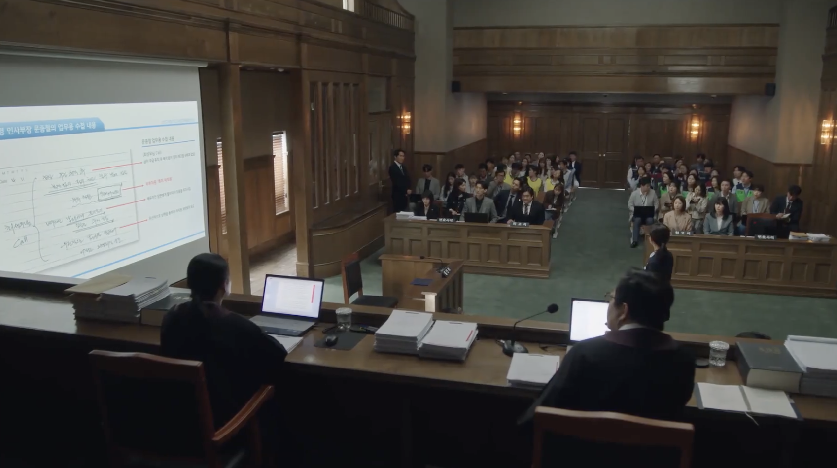 Mr. Moon and Team Hanbada panic at the receipts on the screen; Mr. Moon himself isn’t so sure how his work notebook even got stolen. Attorney Jung attempts to appeal the evidence that was submitted; it was collected illegally as Mr. Moon never consented to it. But since the trial is a civil procedure and not a criminal one, Judge Ryu accepts Mr. Moon’s notebook as evidence. Young-woo watches as Ms. Lee gives a secret thumbs up to someone sitting in the crowd and after watching carefully, she notices that Ms. Lee was communicating to Ms. Choi. Since Ms. Choi does work at Mir Life, she was able to sneak into Mr. Moon’s office and steal his work notebook.