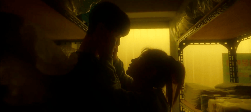 Bo-ra’s intoxicated but Woon-ho is wide awake (and sober). The two stand closely across from each other as they try their best to keep quiet from getting caught. At one point, Bo-ra gathers the liquid courage to cuff Woon-ho’s face in her hands while tip-toeing to get closer to him. Woon-ho assumes Bo-ra’s drunk off some alcohol; she does seem a bit out of it after all.