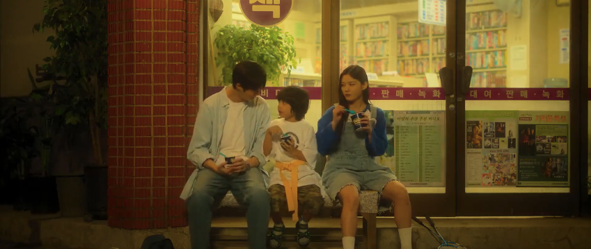 Now that Bo-ra’s aware of where Woon-ho works, she comes up with another tactic to get to spend more time with him: forcing her little brother, Ba-da, to play some badminton with her outside of their store while waiting for Woon-ho to get off of work. Hahaha. It’s quite obvious to Woon-ho what Bo-ra is trying to do as Mom points out that Bo-ra never exercises. Eventually, Bo-ra and Woon-ho sit down with Ba-da to eat some ice cream for a bit before Bo-ra hints at Ba-da to leave. Haha. It’s then that Woon-ho shares how he too has a younger brother who he hasn’t seen in a while.