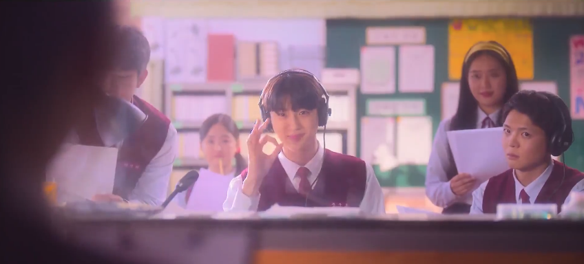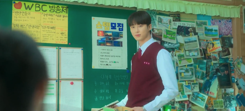 From wearing Hyun-jin’s uniform to noticing Bo-ra chase after the bus that he and Hyun-jin were on to catching sight of Bo-ra’s foot in the nurse’s office as she hid under the hospital bed to the Broadcasting Club meetings, Woon-ho began to take notice of Bo-ra. And soon enough, he reached a realization,