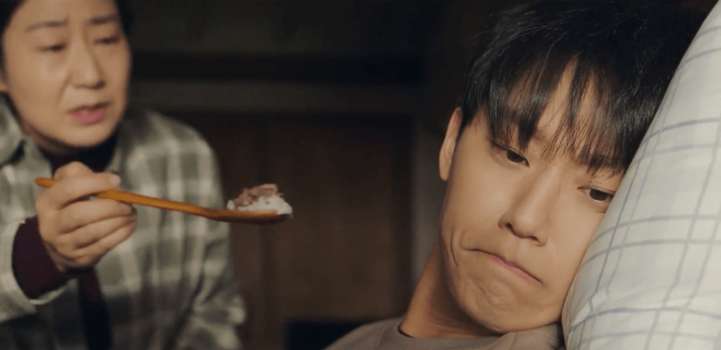 I watched this scene thinking that things would get better between the two and that Young-soon’s behavior as a mom would improve. Now that Young-soon had reunited with her son, she had a second chance at repairing her relationship with her son. She was aware of how much he resented her and despised her for how she treated him growing up. So now that they were living together again and his memories consisted only of his traumatic childhood memories, maybe she would improve and grow as a mother to not repeat history. This scene gave me hope that Young-soon would change. But it only took 10 minutes later within the same episode for Young-soon to return back to being a frustrating character when she used her old strategies and methods in getting Kang-ho to react the way that she wanted. She purposely didn’t feed him as a way to “motivate” him to recover faster physically. She wanted him to be able to move his hands and use his hands to feed himself so she prepared food for him and then took it away after a certain amount of time until he made progress. And sure enough, by the end of the episode, Kang-ho made so much progress that he was able to somehow start feeding himself.
