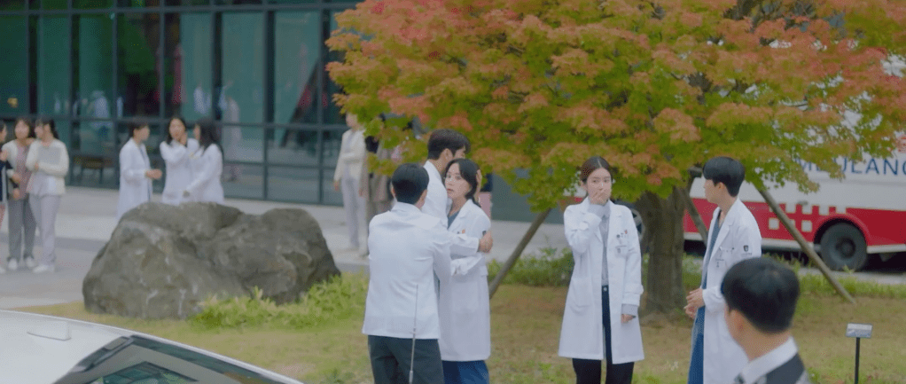 Roy and In-ho cause a scene in front of everyone when they both rush to Jeong-suk’s side to check up on her after she had fallen over the building while attempting to save her patient, Seon-gyu. Thankfully, she and the patient are okay but In-ho and Roy aren’t and they express concern for Jeong-suk. While In-ho grabs onto her hands, Roy places his arms around her and embraces her. Everyone watches in shock as the scene unfolds so Jeong-suk lets both of them go and reassures them that she’s fine. But many of the spectators aren’t and rumors about a love triangle spread throughout the hospital. The rumors even reach Chief Lim and Seung-hi so Seung-hi is advised by Chief Lim to keep an eye on Jeong-suk.