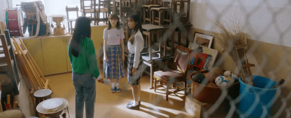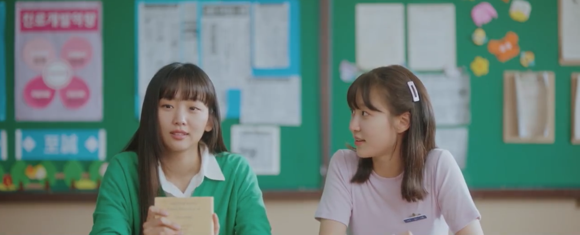 After class, Hae-joon has to quickly give Yoon-young another talk. To avoid any suspicion, Yoon-young shouldn’t stare at him for too long in the classroom. He also notifies her that he’ll pick her up in the classroom after school ends so she shouldn’t go anywhere. When Yoon-young walks away, Hae-joon speaks with Mi-sook afterwards and she asks him about her writing assignment. Hae-joon acknowledges her talent in writing and is confident that she’ll eventually become a successful author. But Mi-sook’s writing is only as good as it is because she receives help with it – in particular from Soon-ae. Mi-sook and Soon-ae privately meet and Soon-ae hands over Mi-sook’s writing assignment over to her after she edited and fixed it. Mi-sook notices that most of her sentences were taken out but she learns to accept it. As long as Soon-ae is editing it, it’ll work. When Mi-sook leaves the room, she steps outside to find Yoon-young standing outside in the hallway. Yoon-young is reminded of her interaction with 2021 Mi-sook who also said the same exact thing to her. So Yoon-young confronts Mi-sook in front of Soon-ae back inside the room and she’s baffled by how fake Mi-sook is. She had been doing this for so long and was good at pretending like her content was all original. She threatens to report Mi-sook to the teachers but Soon-ae stops her and sides with Mi-sook instead. Soon-ae claims that she chose to help Mi-sook with her writing assignment and they walk away together. Yoon-young assumes that there must be a reason as to why her mom gave in to Mi-sook.