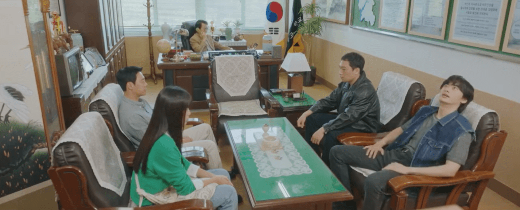 Hae-joon and Yoon-young end up finding themselves sitting in Principal Yoon’s office. But they’re not as pleased and thrilled because the people they’re sitting across from are their favorites, Detective Baek and Hee-seob! Hahaha. Principal Yoon greets Yoon-young and Hee-seob – the two new transfer students at the school – and he also introduces Hae-joon to Detective Baek as Hee-seob’s homeroom teacher. Yoon-young learns that Detective Baek is Hee-seob’s uncle so she’s related to him. All Hee-seob can think about is how he had already bumped into both Yoon-young and Hae-joon before so this isn’t their first time meeting. Haha. The room is full of family kins and relationships: Detective Baek with his nephew Hee-seob, Yoon-young with her dad, and Principal Yoon with his grandson Hae-joon.