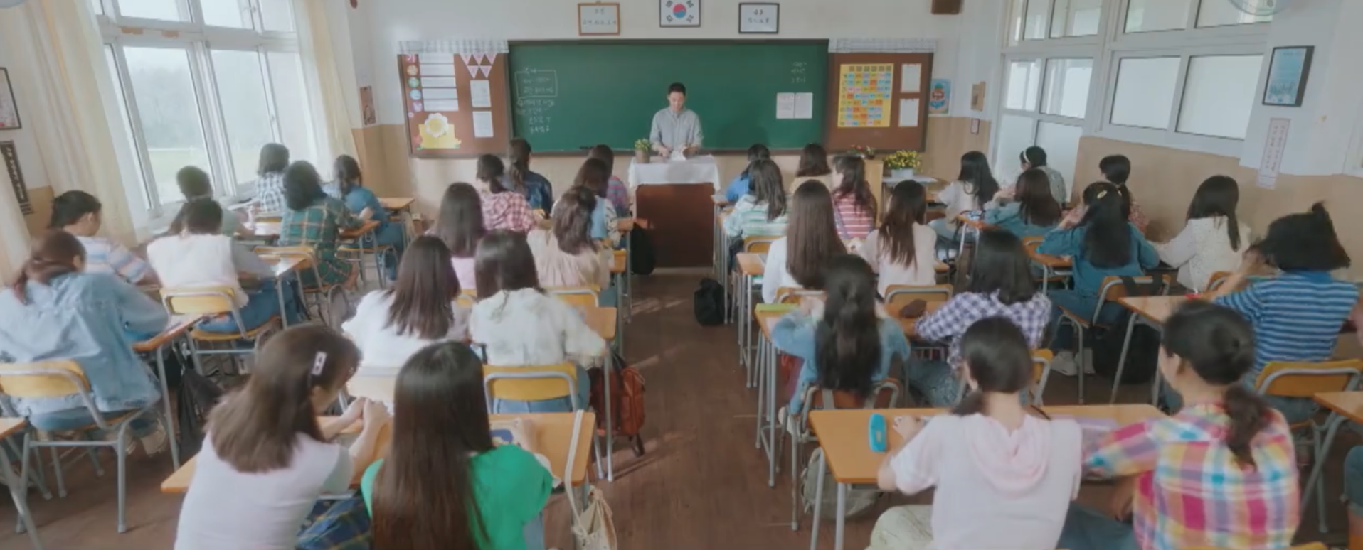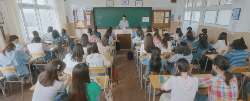 Yoon-young enters her classroom and is introduced to her classmates which includes Hae-kyung, Eun-ha, and Yu-ri as well as Mi-sook. Soon-ae is also present and she sits at her desk in the back of the classroom. The teacher has to warn Hae-kyung, Eun-ha, and Yu-ri to not bully Yoon-young and it’s clear that Mi-sook is the only student in the classroom who the teacher admires and has hope in. Yoon-young seats herself at the empty spot next to her mom. Meanwhile, Hee-seob is introduced to his classmates in his classroom but he’s a man with few words. When asked to introduce himself, all he states is his name because according to him, giving a long introduction goes against the spirit of rock and roll (his favorite type of music). I am literally laughing out loud at this scene. It is so funny! So Hae-joon lets it go and he lets Hee-seob pick his desk as he leaves the classroom.