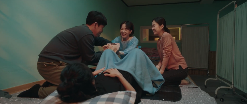 But the night isn’t finished just yet and a man rushes into the main village with his pregnant wife who’s about to give birth any moment. There isn’t an obstetrician among the group of doctors on the trip and the hospital is an hour away. So Jung-min gathers all the doctors who didn’t drink to see who can help out while Jeong-suk forces In-ho to wake up to also help out. When the group convenes, they’re not so sure how the delivery will work. Everyone’s speciality is unrelated and it’s been two decades since In-ho himself has assisted with a delivery. But they don’t have time so they quickly go to the pregnant mother to help her. Jeong-suk takes the lead while In-ho steps outside to puke. Thankfully, the delivery is successful and the mom is in stable condition. In-ho goes back in to give Jeong-suk another tip before he hurries back outside for a round two of puking. Oh and the hot water that he told the residents to boil? Use that to clean the baby.