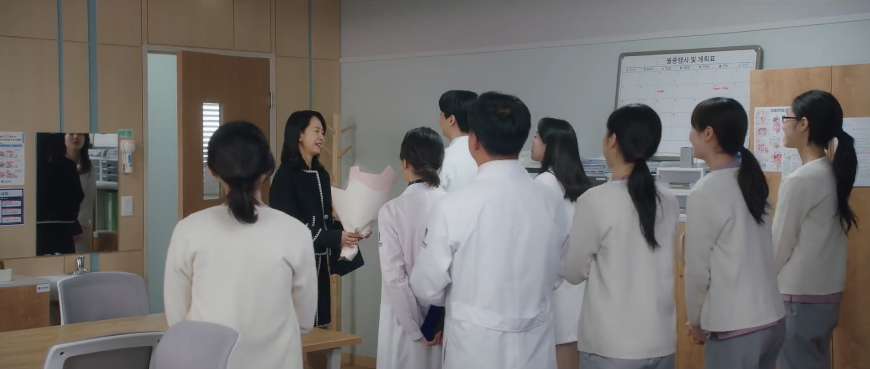 In-ho and Seung-hi also bid their farewells with each other at work. Seung-hi is going to leave to take over her late father’s hospital. She wishes In-ho the best of luck on his surgery with Jeong-suk and she also hopes that they will keep in contact in the future. Eun-seo is still In-ho’s child after all. So with that, Seung-hi and In-ho also end their relationship. Seung-hi receives a surprise congratulatory party from her Family Medicine residents who are all sad at the thought of her leaving. They give her some flowers and congratulate her on her new journey. Jeong-suk comes across Eun-seo waiting at the hospital for her mother so she has a talk with the high schooler. Similar to her talk with I-rang, Jeong-suk checks in with Eun-seo and hopes that Eun-seo will forget about all the bad things that happened and rather enjoy her life. None of this was ever her fault and she went through a lot due to all the adults. Eun-seo tears up upon hearing Jeong-suk’s words.