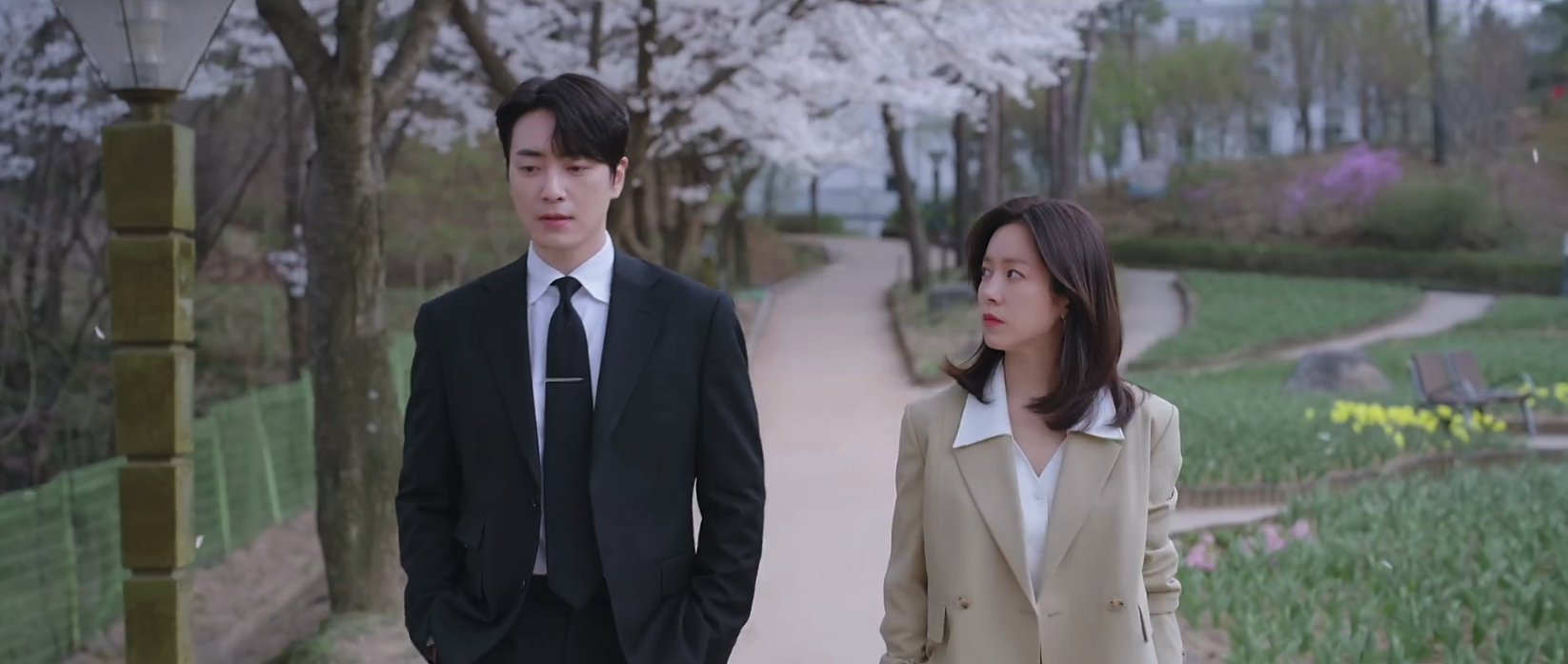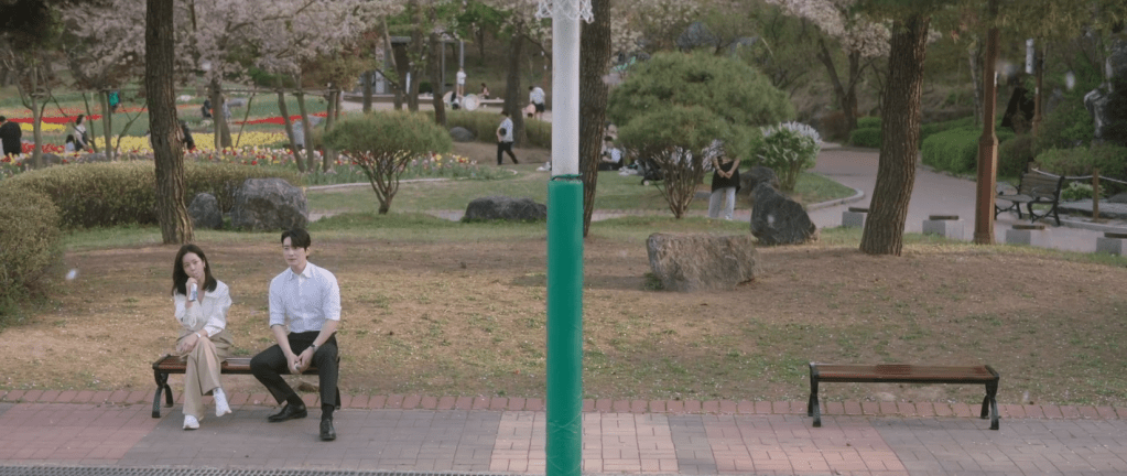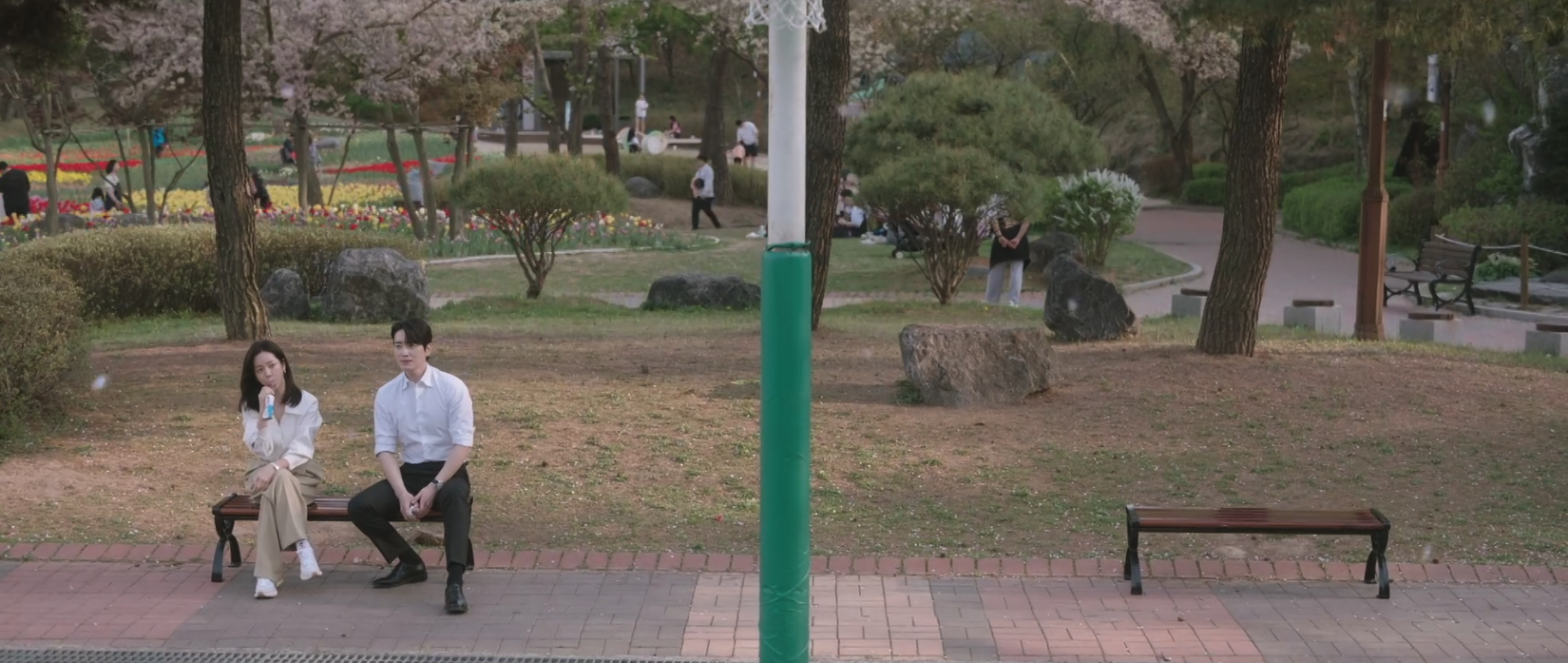 Eun-ho notices the change in Ji-yoon’s behavior so he suggests that they go on a walk to get some fresh air and a change of scenery. He’s even packed her walking shoes in her car trunk to prepare for the occasion (he is always so prepared! I love it!). Though he might not be the best at eating spicy rice cakes, he is good at going on walks. So the two embark on a stroll at a park with cherry blossom petals falling all around them. They walk in silence for 30 minutes and Ji-yoon’s curious as to why Eun-ho hasn’t asked her about Hye-jin. But Eun-ho respects Ji-yoon’s boundaries and he doesn’t want to probe. She doesn’t have to explain herself. Their special (and silent) walk leads them to a basketball court with a group of 4 kids. It turns out that Ji-yoon enjoys playing basketball and the two play a game against each other. In the end, Ji-yoon scores a game-winning shot and it seems like she had more fun playing basketball than the little ones, haha. Ji-yoon and Eun-ho conclude the eventful game by eating some yummy ice cream on a bench and admiring the beautiful scenery. Eun-ho will let Ji-yoon easily win the next time they play another game, haha.