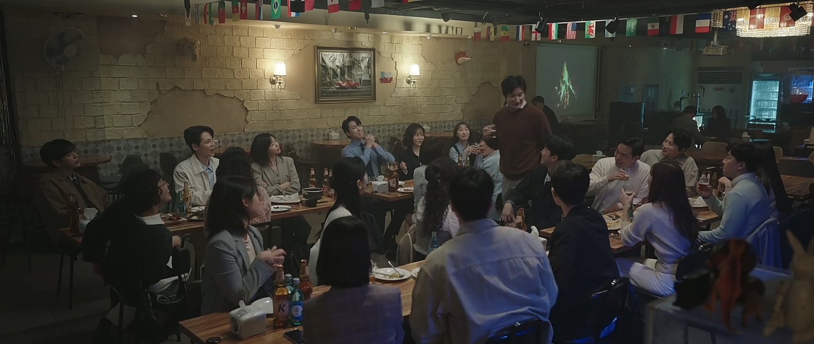 It’s time for Eun-ho’s welcome party and Peoplez staff gather at the restaurant. To loosen up, Eun-ho requests for Young-soo to give a little message to everyone in attendance so Young-soo unleashes a joke that no one really finds funny.. Everyone except for Gyeong-hwa. She’s the only one to laugh at his joke which brightens up the mood and gets everyone else to join in. Gyeong-hwa and Young-soo eventually make up with each other by apologizing. The awkward tension between the two is resolved and everyone can now finally have some fun without worrying about them. But Eun-ho is worried; he’s worried about Ji-yoon and he sends her a few text messages to check in on her. He reminds her to eat some dinner since she’s working late and also sends the address of the restaurant that they’re at just in case she wants to join. So Ji-yoon does the unexpected and she shows up to the restaurant. But Eun-ho doesn’t notice her at first because he’s distracted with something else. While on a phone call outside with Byeol, he overhears firetruck sirens which reminds him of a memory from when he was younger. He’s trapped in his apartment that’s on fire and other tenants in the building are rushing downstairs to escape. Eun-ho jumps out of his trance after hearing Ji-yoon call out his name multiple times and they’re quickly joined by the rest of the group. Jung-hoon was the only one to leave early because he assumed that Ji-yoon was still working at the office. But by the time he arrives at the office he discovers that he’s the only one there. Of course, she’s with the rest of the group.