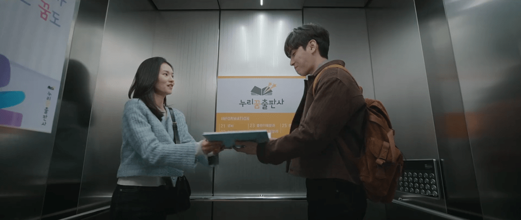 Jung-hoon meets with one of their clients, a publishing company. While at the meeting, he discovers Soo-hyun at the same location as him and discovers that she’s a writer. Haha. While in the elevator together, Jung-hoon grabs one of her books that he got from the publishing company and asks for her autograph. It’s sort of an investment for when she eventually becomes a successful and bestselling author. Soo-hyun signs the book for Jung-hoon and bids farewell to him. Of course, Jung-hoon is Jung-hoon and he embarrasses her in front of people as she walks out of the elevator with his silly antics. Haha. They’re both so cute.