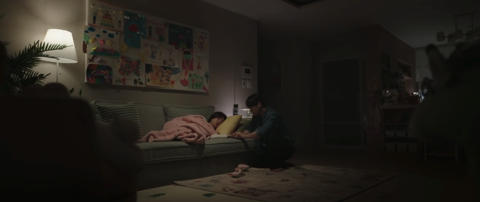 So just how exactly did Eun-ho end up sitting by Ji-yoon on the couch overnight? Turns out he overheard her crying in her sleep that night, repeating the words “don’t go” a few times. He makes his way to her side and reaches his hand out to hold hers. He reassures her that everything’s all right and pats her hand a few times to calm her down. It eventually works and Ji-yoon stops crying in her sleep. Even after she calms down, Eun-ho doesn’t leave and he chooses to stay by her side the entire night.